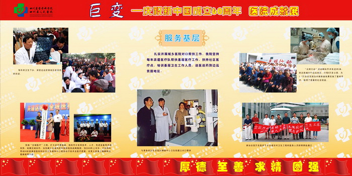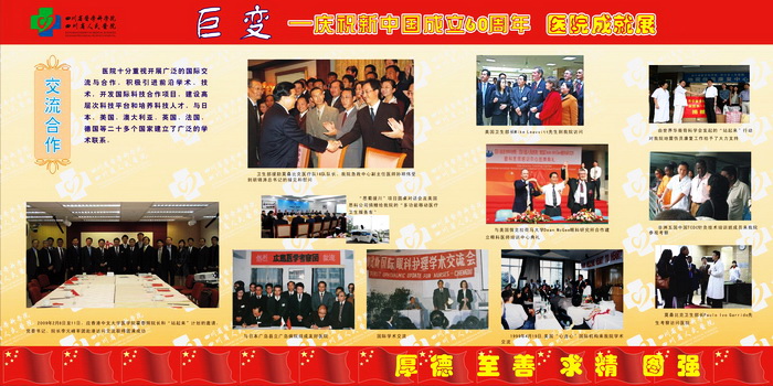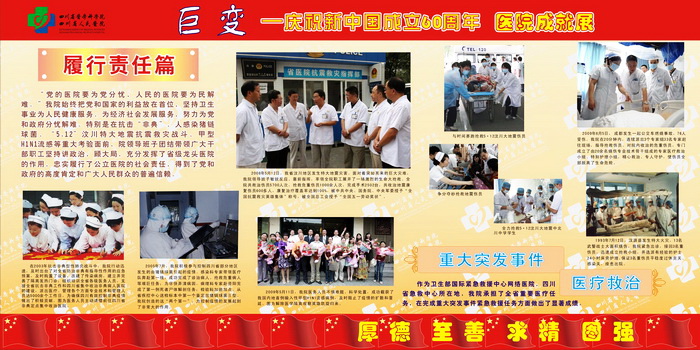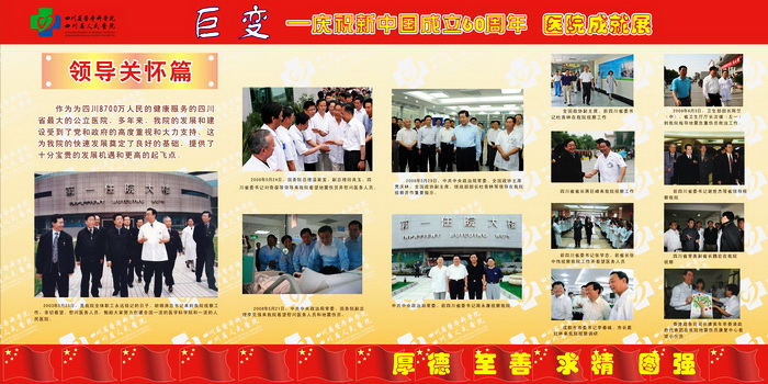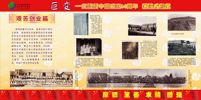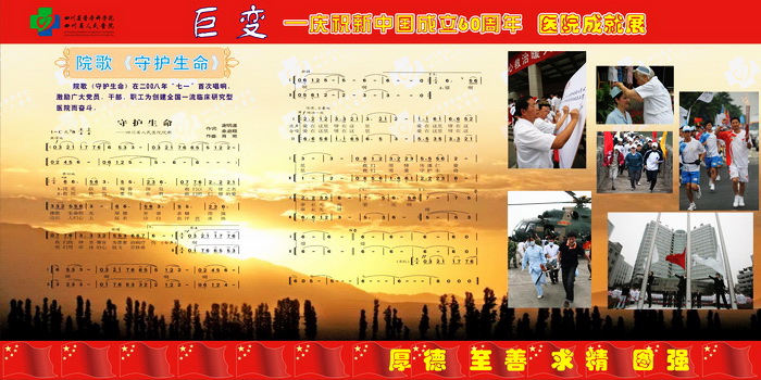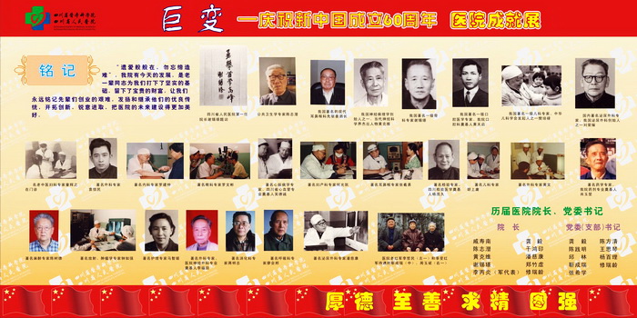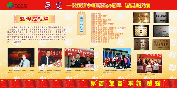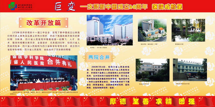 60年风雨征程,60年欢歌笑语,都化成一滴滴的细雨,滋润着阳光、朝气、风华正茂的四川省医学科学院•四川省人民医院迈向成熟和辉煌。"大鹏一日同风起,扶摇直上九万里"。站在新的历史起点上,我们深感肩头责任重大,使命光荣而艰巨,我们将牢记"厚德、至善、求精、图强"的当代省医精神,用我们温暖的爱心躬行以人为本的理念,用坚韧不拔的精神永攀医学科学技术的高峰,为人民的生命健康、为社会的和谐进步、为把我院建设成为全国一流临床研究型医院作出新的更大的贡献!