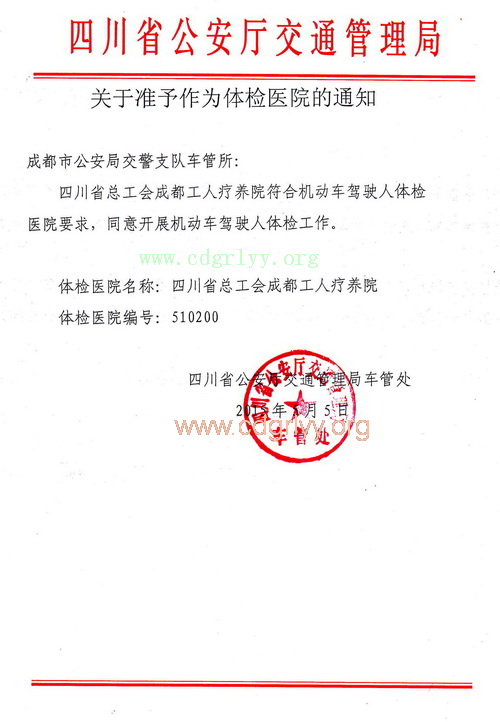 四川省总工会成都工人疗养院符合机动车驾驶人体检医院要求,同意开展机动车驾驶人体检工作。