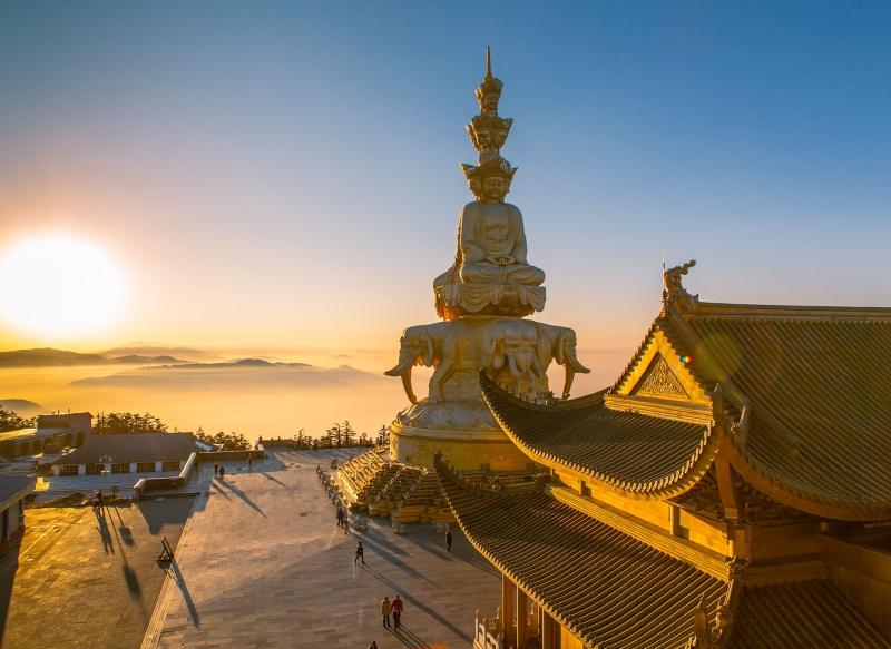 印度佛教首次传入中国即通过丝绸之路到达峨眉山,公元1世纪,在峨眉山上建造了第一座佛教寺院。当时称普光殿,后改名为光相寺,1614年,明神宗朱翊钧御题横额称“永明华藏寺”。其余30座寺庙包括万年寺(公元4世纪)内含宋代高7.85米普贤铜像通,寺庙亭台楼阁包括清音阁(公元6世纪)、报国寺(17世纪)和伏虎寺。佛教文化构成了峨眉山历史文化的主体,所有的建筑、造像、法器以及礼仪、音乐、绘画等都展示出佛教文化的浓郁气息。山上多古迹、寺庙,有报国寺、伏虎寺、洗象池、龙门洞、舍身崖、峨眉佛光等胜迹,是中国著名的休养、避暑目的地之一。